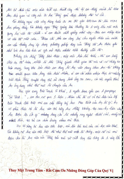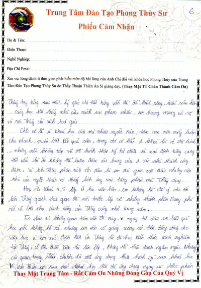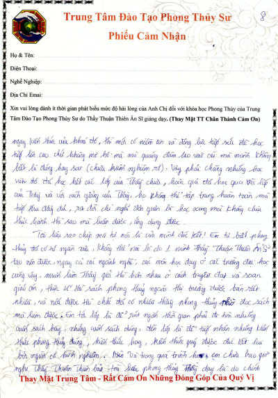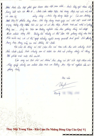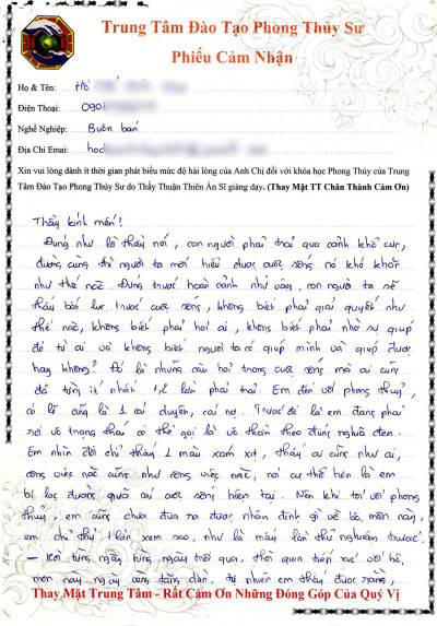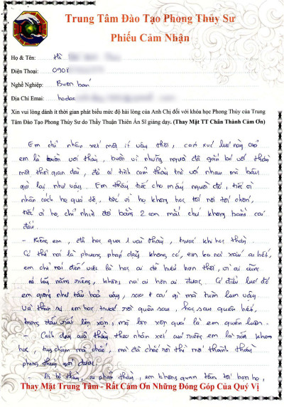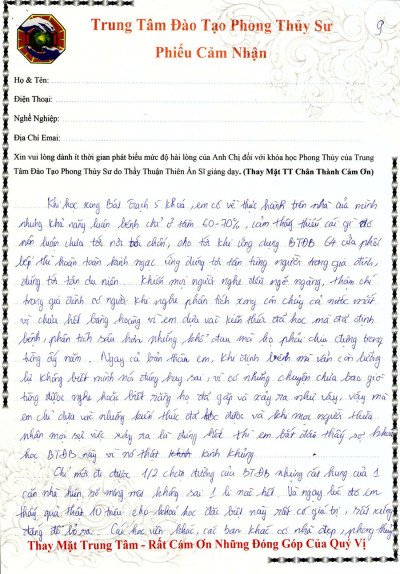 Em không ngại cất công hàng tuần đi xe đò gần 400km để lên HCM học Phong Thủy. Em không ngại Thầy giảng bài thường đi 1 vòng lớn rồi mới quay lại vấn đề chính vì Em thích cách dạy như vậy, đưa Em nhập tâm về vấn đề rất sâu, thậm chí khi Em dạy lại cho người thân của mình, Em vẫn thường hay áp dụng phương pháp dạy của Thầy để học được ghi nhớ bài lâu hơn, và gợi mở được nhiều tình huống, vấn đề hơn.