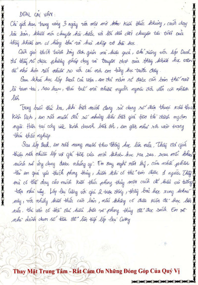 Cách giải thích, trình bày đơn giản mà hiệu quả. Chỉ riêng với lớp Deal đã thấy rõ được phương pháp dạy và truyền đạt của Thầy khiến học viên nhớ hơn rất nhiều so với các nơi Em từng học trước đây. Sau lớp Cải Vận, Em đã nắm rõ được căn bản: thế nào là Tam tai, Sao Hạn, Thái Tuế mà người ngoài đời vẫn còn nhầm lẫn.