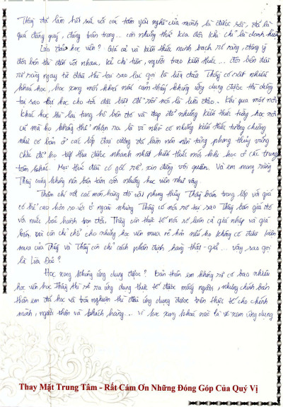 Lớp Trạch Nhựt: Thầy thực sự khiến học viên có niềm đam mê về môn học. Thầy phân tích từng bài rất kỹ lưỡng, chỉ 1 vấn đề đơn giản để vô bài học, Thầy thường đi 1 vòng lớn rồi mới đưa học viên quay về lại vấn đề chính để khẳng định và xác minh vấn đề cần chốt lại là đúng hay sai hoặc như thế nào là chính xác nhất. Tưởng chừng đơn giản nhưng thực sự không hề đơn giản, với cách thức dạy như này, Thầy mở rộng ra rất nhiều vấn đề xã hội khác cần học hỏi và mở rộng tư duy nhiều, rất bổ ích.
