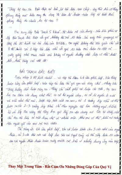 Giai đoạn học Trạch Nhựt và Kinh Dịch là khoản thời gian Em chịu nhiều áp lục và nỗi buồn từ chuyện gia đình, người thân, thậm chí Em từng nghĩ quẩn. Song, khi ngày được lên lớp, được nghe Thầy giảng bài và giải thích các thuyết, sự tích, vấn đề liên quan đến đạo Thiên Chúa, đạo Phật, Nho giáo… làm chính Em khôi phục lại niềm tin của mình. Nhiều học viên nói Thầy nói lang mang, không vô vấn đề chính, nhưng đối với Em thì giai đoạn đó, nhờ những bài giảng của Thầy đã làm Em chú tâm và 1 phần nào đó giúp Em trụ vững, có niềm tin thật sự để vượt qua giai đoạn khó khăn.