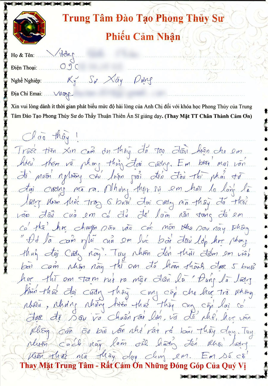 Trước tiên xin cảm ơn Thầy đã tạo điều kiện cho Em hiểu thêm về Phong Thủy Đại Cương. Em biết mọi vấn đề muốn nghiên cứu, luận giải đến đâu thì phải từ Đại Cương mà ra. Nhưng thật sự Em hơi lo lắng là lượng kiến thức trong 6 buổi Đại Cương mà Thầy đã thổi vào đầu của Em nó có đủ để làm nền tảng để Em có thể học chuyên sâu vào các môn sau này hay không? Đó là cảm nghĩ của Em lúc bắt đầu học Phong Thủy Đại Cương này.